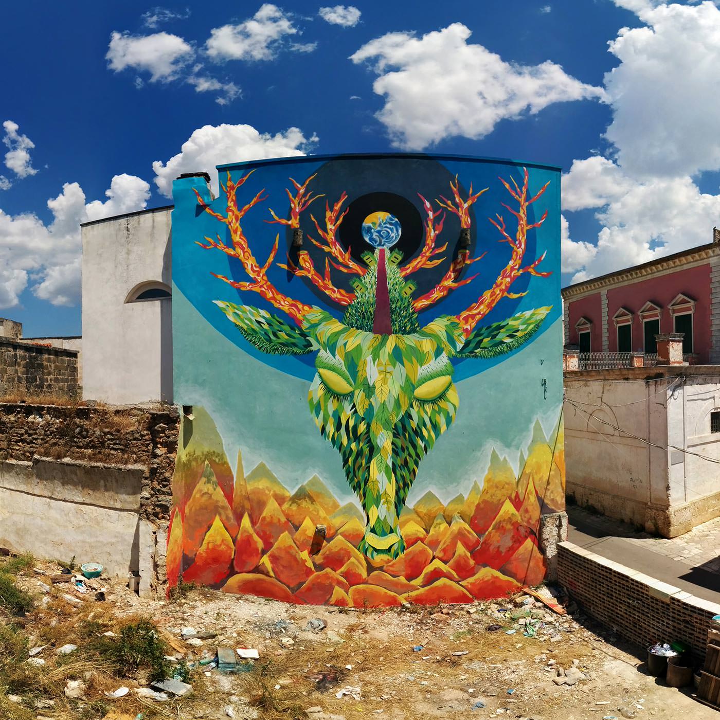 Direzione is a mural that speaks about coexistence and sustainable path. The wall is coinceved as a sacred apparition and feeds itself and described with a symmetrical and solemn taste close to religious art.